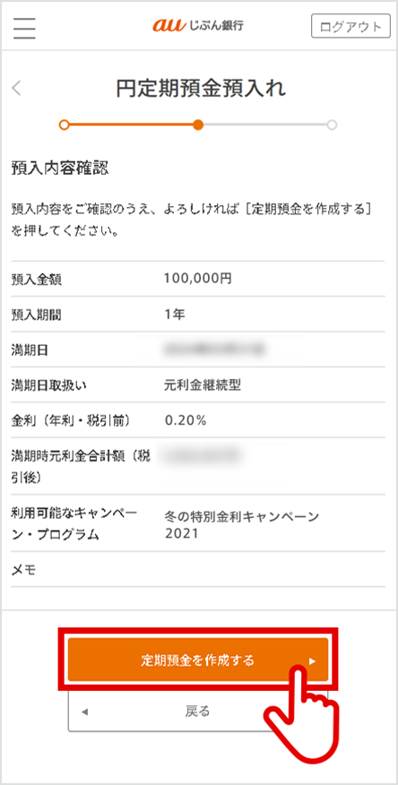 預入内容を確認し、[定期預金を作成する]を選択して完了