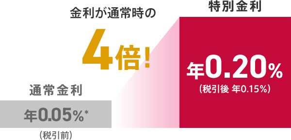 キャンペーン期間中、「1年もの円定期預金」をお預入れの場合、特別金利 年0.20%(税引後 年0.15%)を適用します。