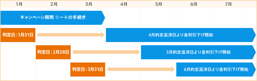 適用判定日の3ヶ月後の約定返済日より年0.03%の引下げが適用開始となります。
