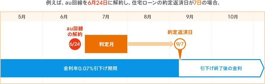 au回線や家族割プラスを解約するなど、auモバイル優遇割の適用条件を満たさなくなった日の翌月を判定月とし、判定月の翌々月の約定返済日から年0.07%の引下げが終了し、約定返済額が変更となります。