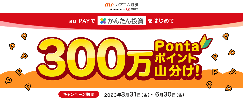 - キャンペーンの対象可否についてauカブコム証券からのご案内はございません。Pontaポイントの加算をもって対象のお知らせとさせていただきます。