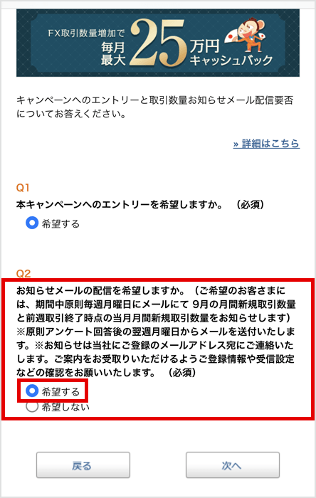 • エントリー時に回答いただくアンケートのお知らせメール配信要否を確認する設問にて、「希望する」を選択されたお客さまには、9月の月間新規取引数量と前週取引終了時点の当月月間新規取引数量をメールにてご連絡いたします。