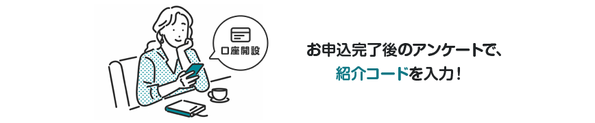 - 口座申込後に表示される「口座開設に関するアンケート」のキャンペーンコード欄に、紹介する方の「紹介コード」を入力すること