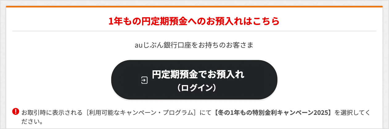お取引時に表示される[利用可能なキャンペーン・プログラム]にて【冬の1年もの特別金利キャンペーン2025】を選択すること。