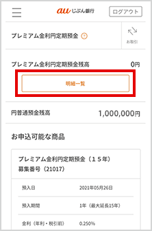 インターネットバンキングにログイン後、「円預金」メニュー→「プレミアム金利円定期預金」→ 「明細一覧」画面の「一覧照会」にて、取引種別を「すべて」に選択することで、最新の明細日付をご確認いただけます。