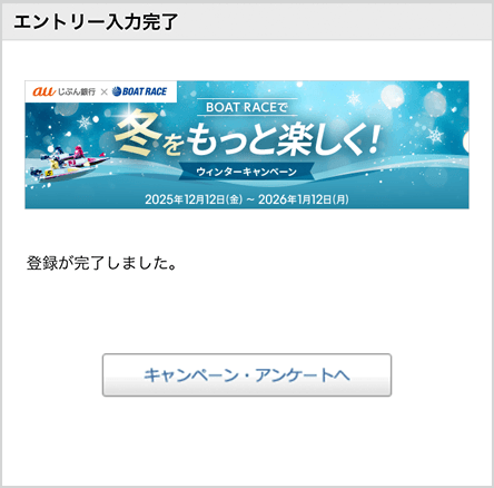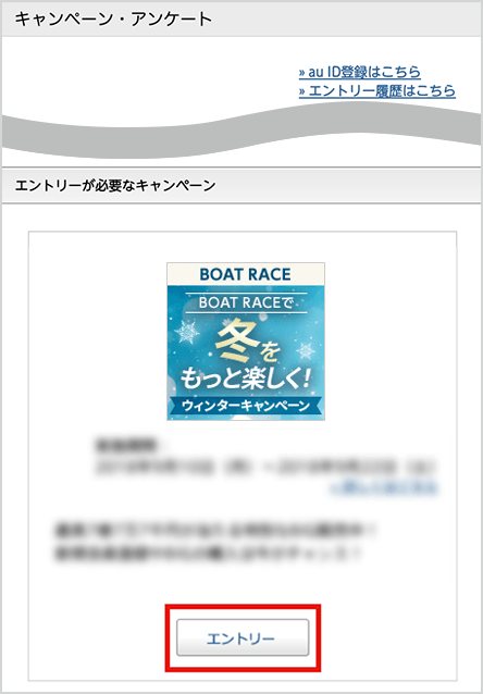 キャンペーンページのエントリーボタンを押してログイン後、「BOAT RACEで冬をもっと楽しく!ウィンターキャンペーン」を選んでエントリーボタンを押す