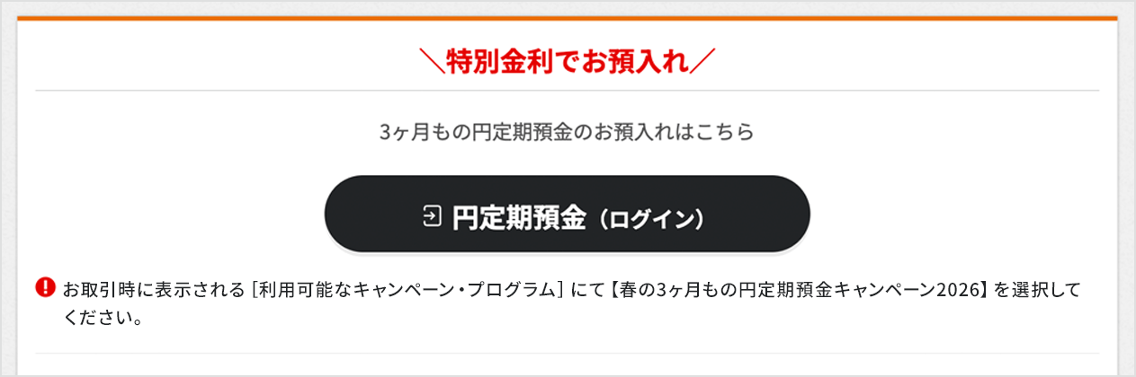 お取引時に表示される[利用可能なキャンペーン・プログラム]にて【春の3ヶ月もの円定期預金キャンペーン2026】を選択いただくことで、キャンペーン金利を適用いたします。 -