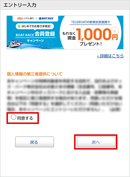 「個人情報の第三者提供について」を確認のうえ、「同意する」を選んで「次へ」ボタンを押す