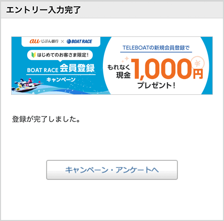 期間中、エントリーのうえ、auじぶん銀行口座を指定してTELEBOATへ新規会員登録をされたお客さまにもれなく現金1,000円プレゼント!