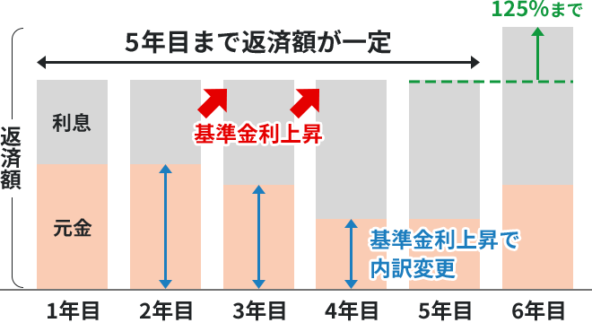 - お借入後の返済額は、「5年ルール※」により、お借入後5回目ごとの10月1日を基準日とする借入金利の見直しを行うまで変更はありません。この期間中に借入金利が上昇すると、返済額は一定のまま「元金」充当額は減り、「利息」が増えます。