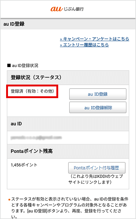 - ※「登録済(無効)」と表示されている場合は、もう一度[au ID登録]ボタンを押して、au IDを登録し直してください。登録が無効となっている場合は、一部特典の対象とならない場合があります。